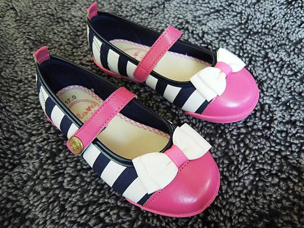 藍白條紋和可愛的蝴蝶結,再加上前面跟鞋帶的亮桃紅點綴,整雙鞋非常跳。