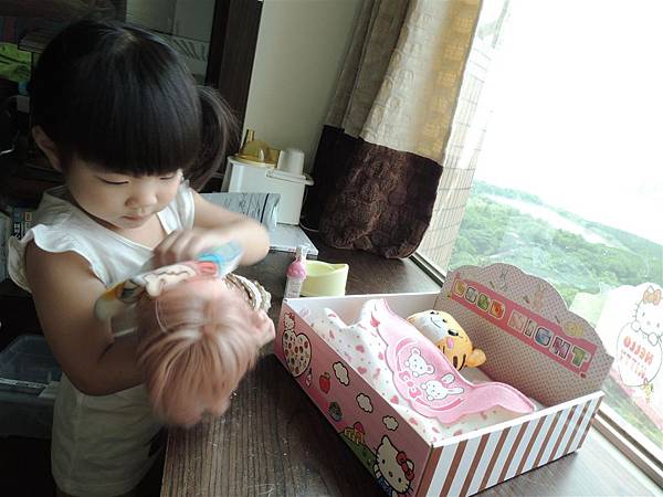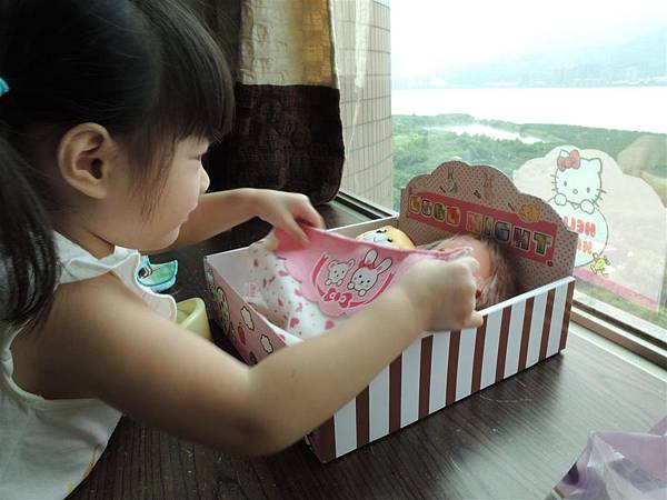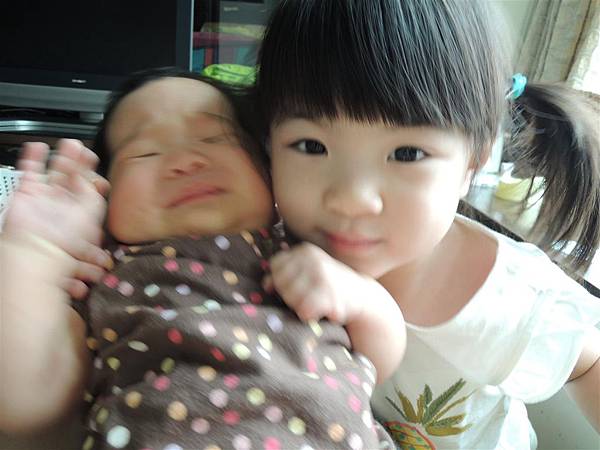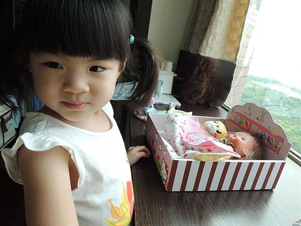 蘋果在玩小美樂睡覺遊戲時,我抱著糖果妹在旁邊一起玩,