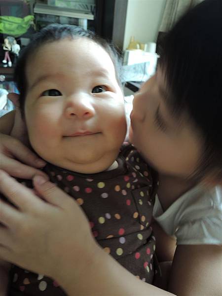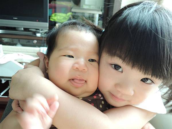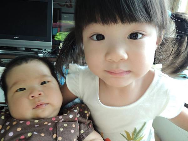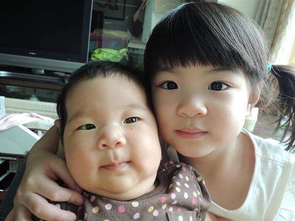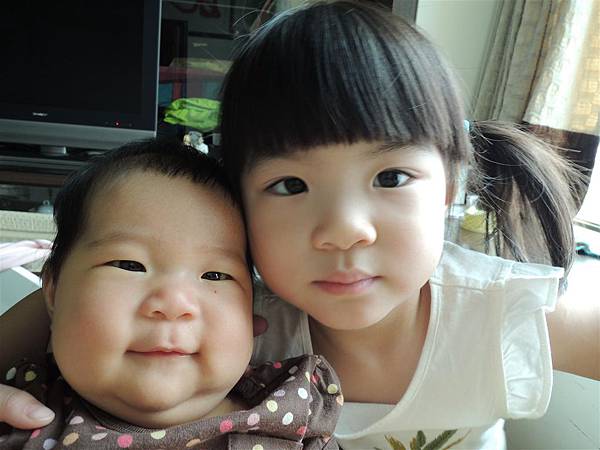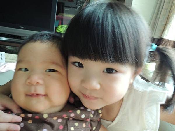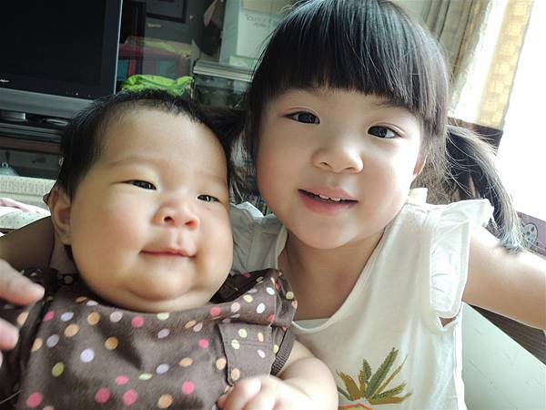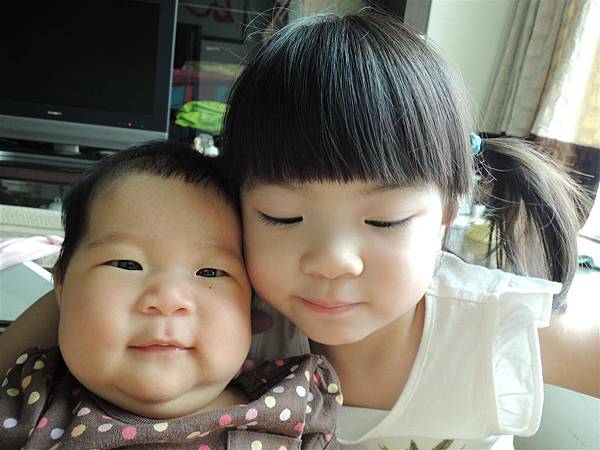 蘋果看到立刻湊上前也要跟妹妹一起拍照,
