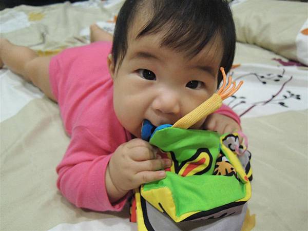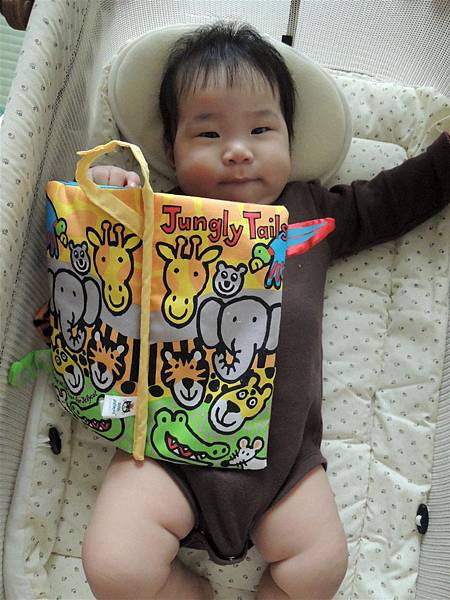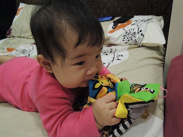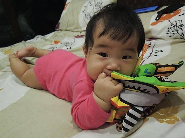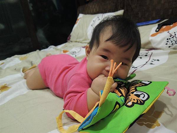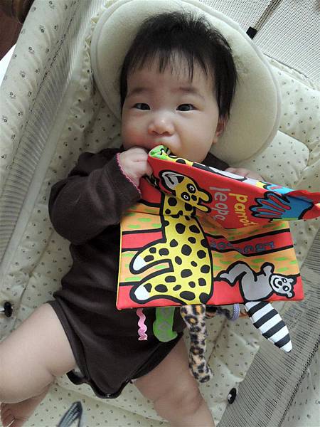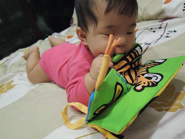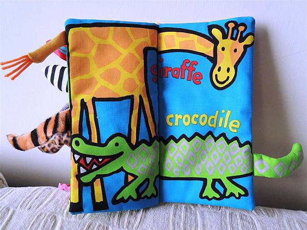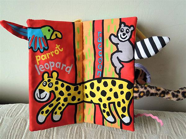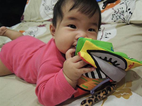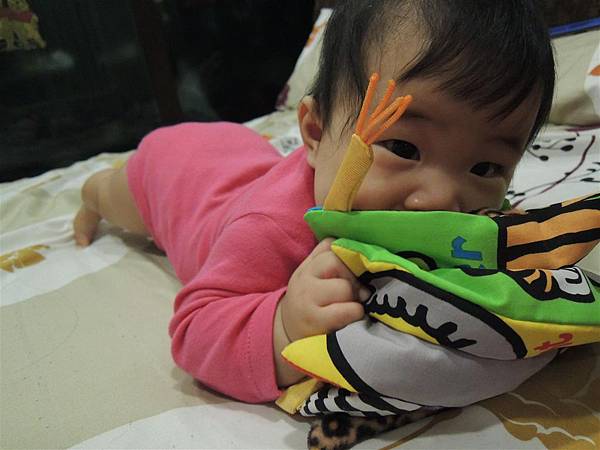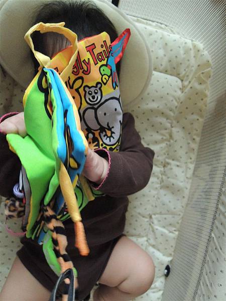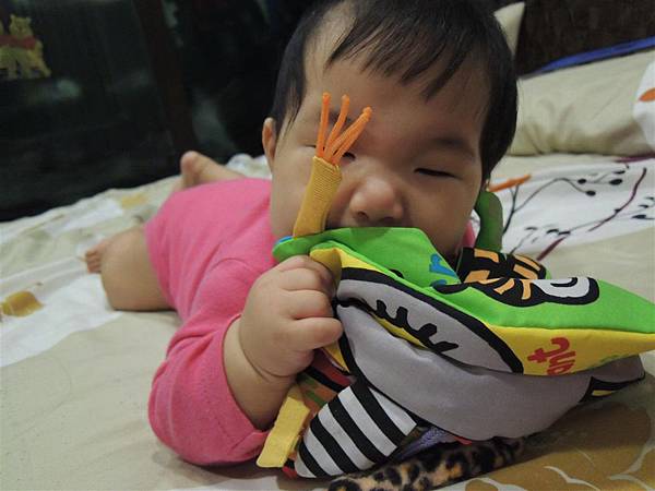 糖果妹四個月就長兩顆下門牙了,所以Jelly Cat的叢林動物尾巴布書剛好有許多長尾巴可以讓她磨牙~:p