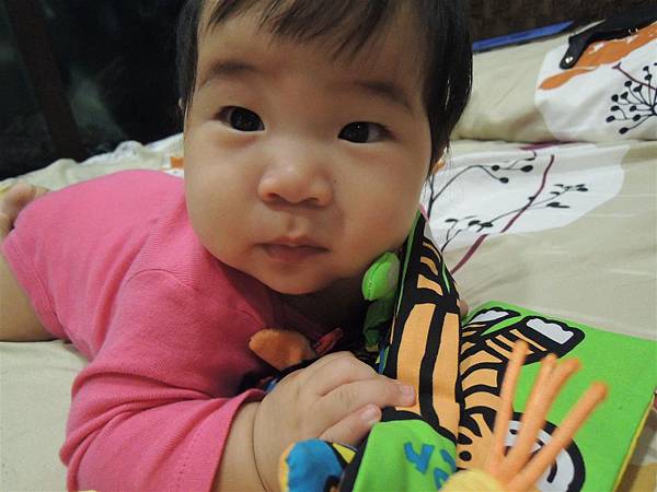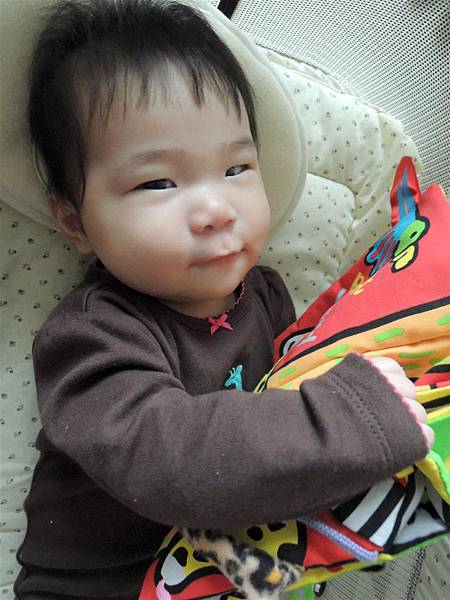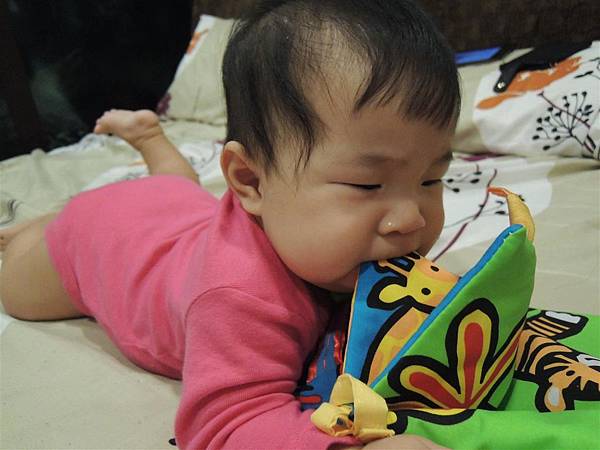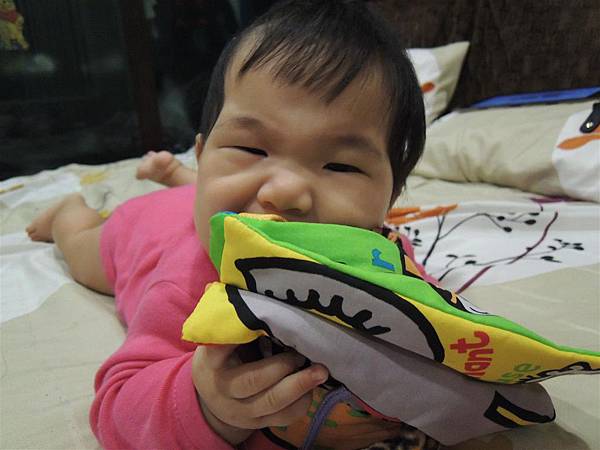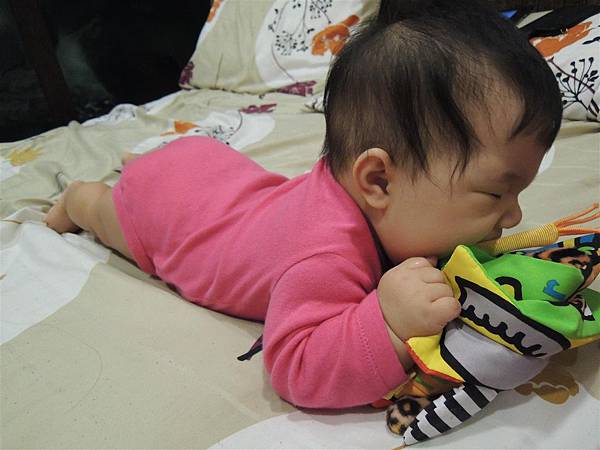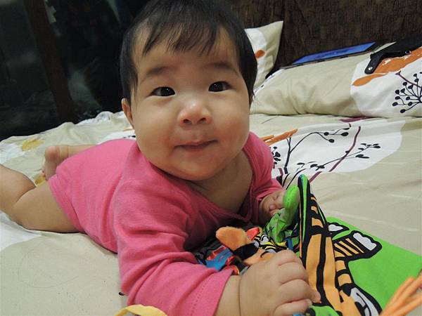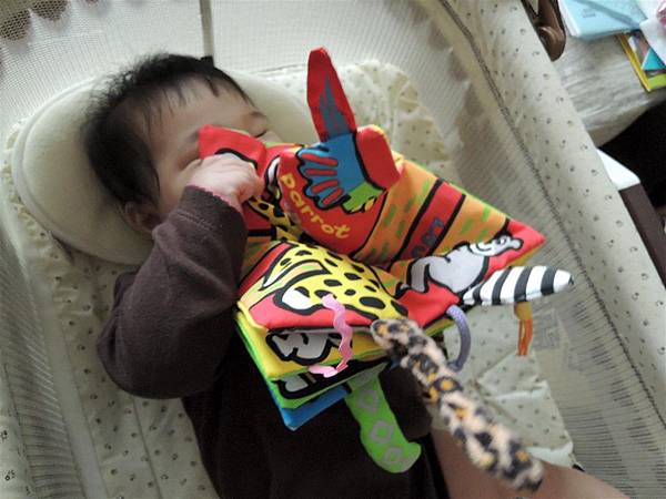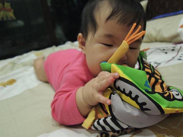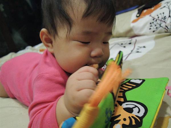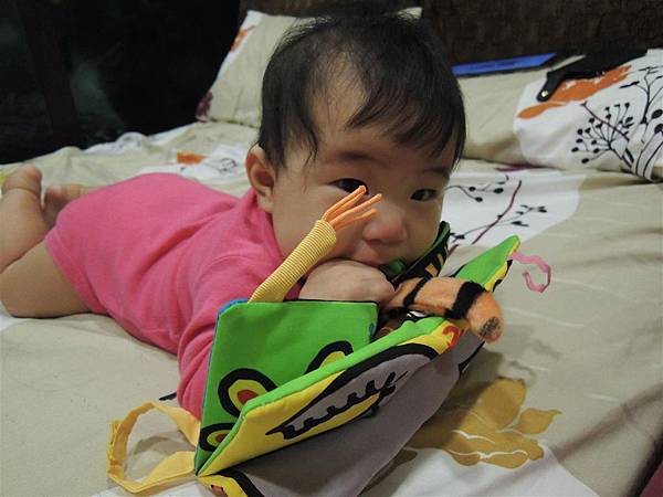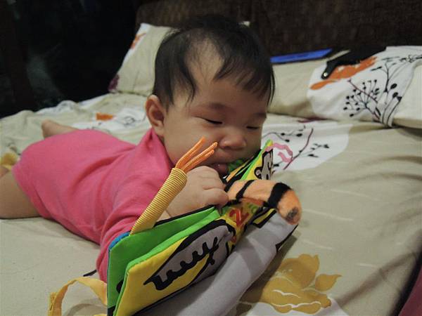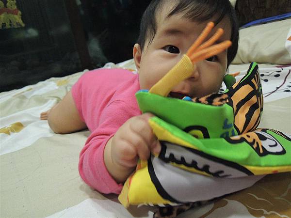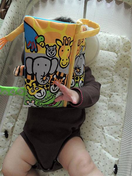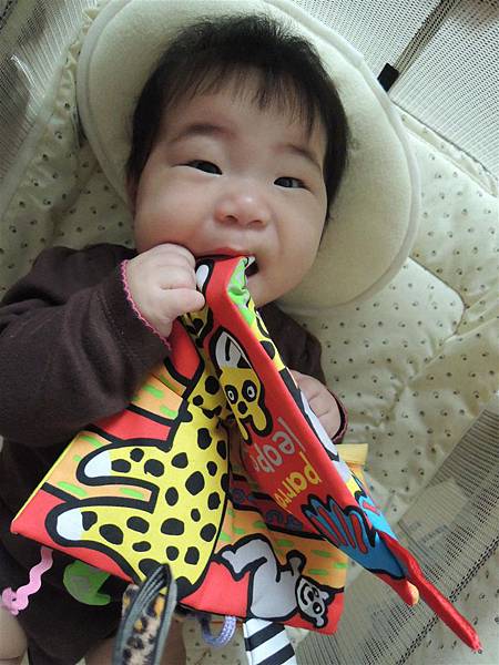 糖果妹四個月就長兩顆下門牙了,所以Jelly Cat的叢林動物尾巴布書剛好有許多長尾巴可以讓她磨牙~:p