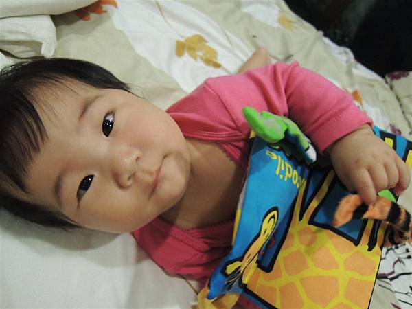 前面幾張照片是糖果躺在小床上自己玩的畫面,