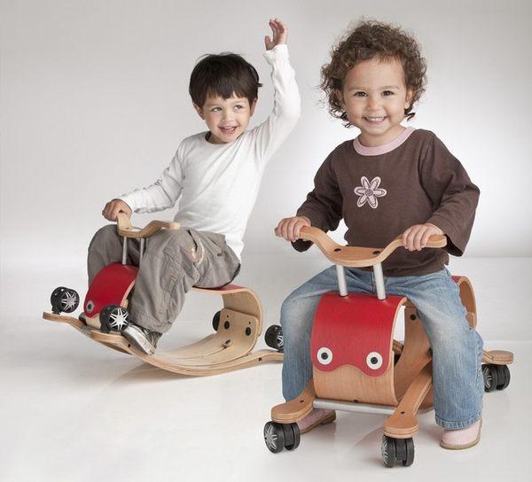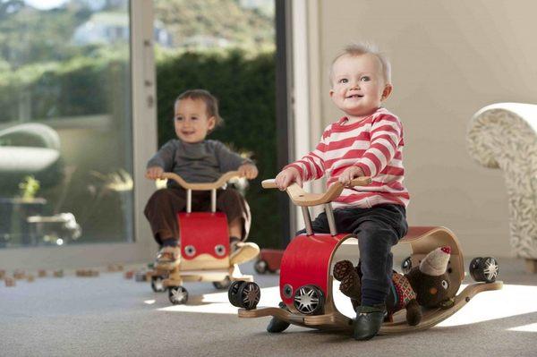 嬰兒們的示範照:左邊是四輪車、右邊是搖搖馬,