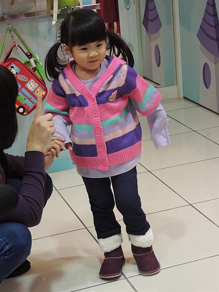 我先把第一套淺紫色與粉彩針織外套的童裝給蘋果看,