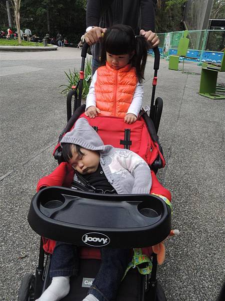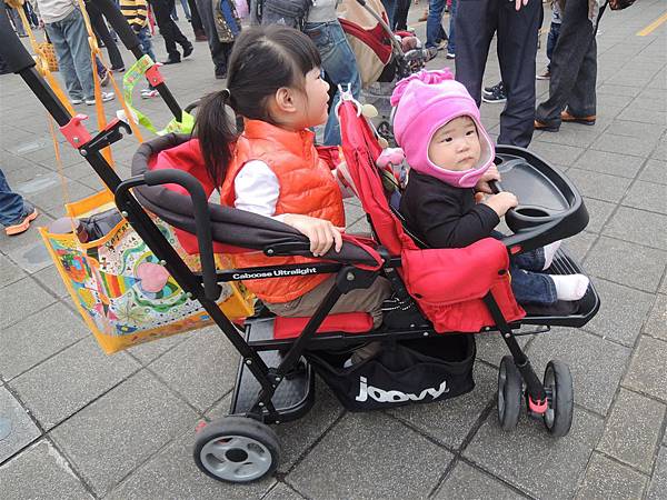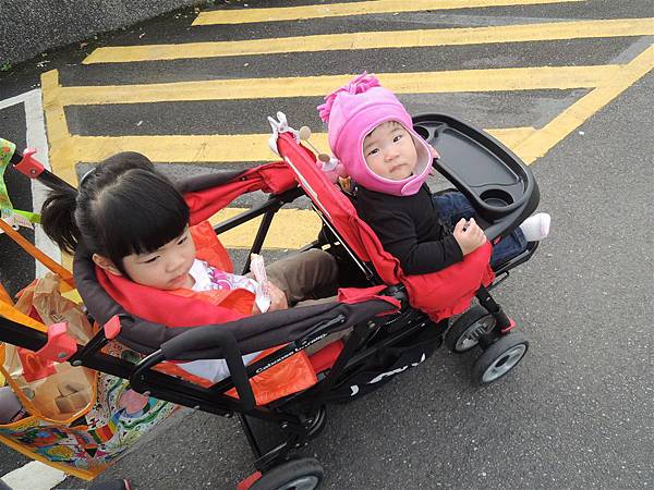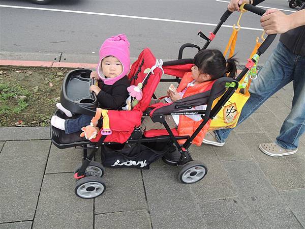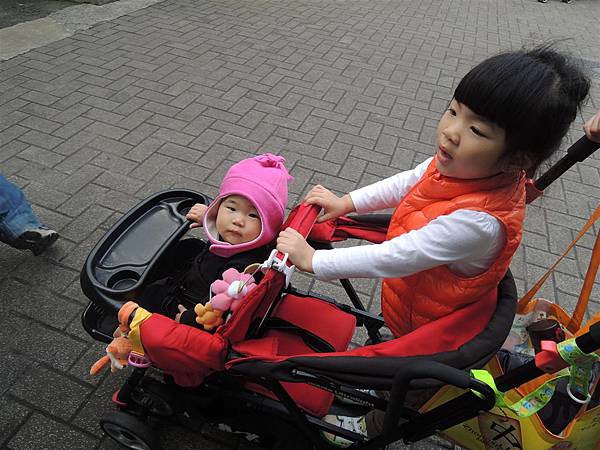 兩姊妹坐在Joovy上我就可以充分控制住兩個的行動,不用又牽用推了~
