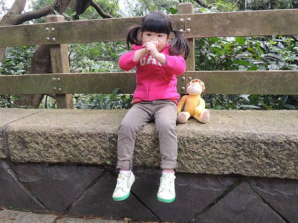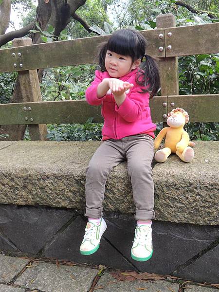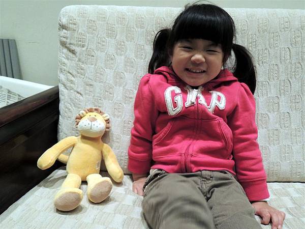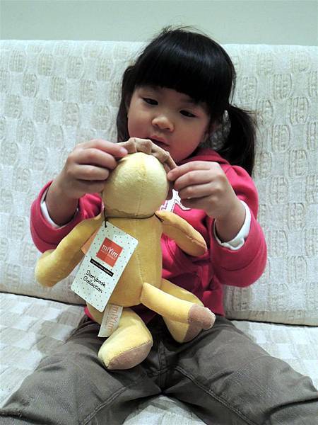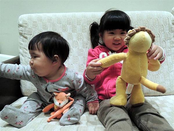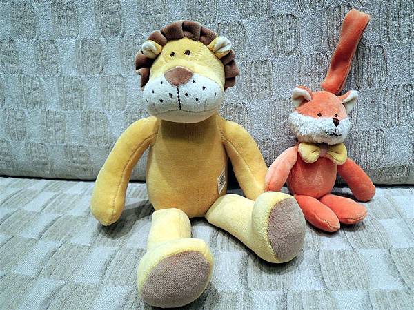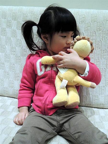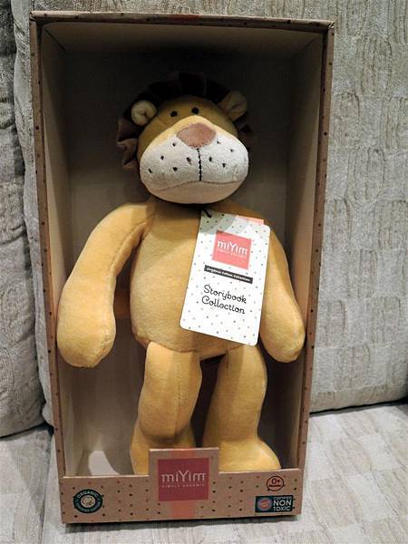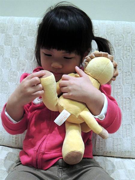 這次收到的兩件商品中,故事書系列的里歐獅子正巧是32cm適合她四處玩耍摟抱的尺寸,