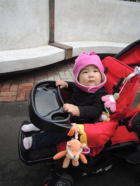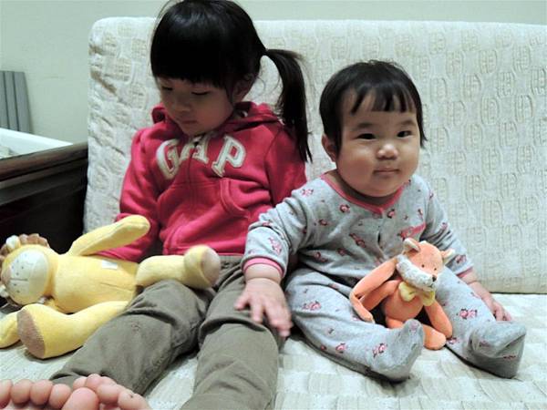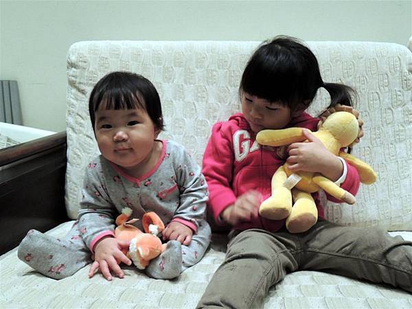 蘋果在研究妹妹的福斯小狐推車娃娃,