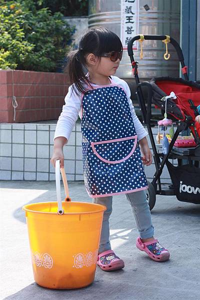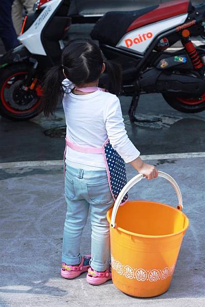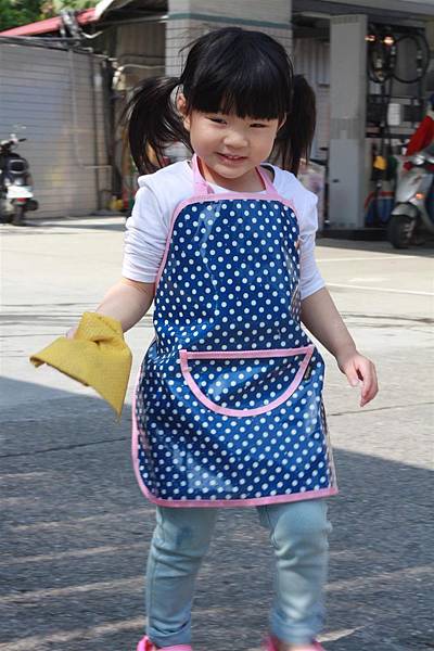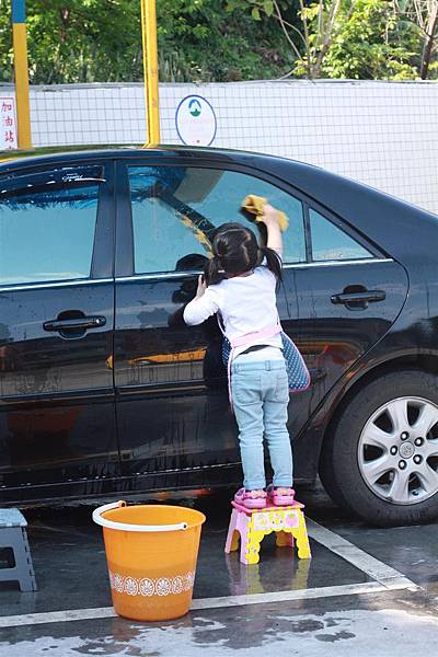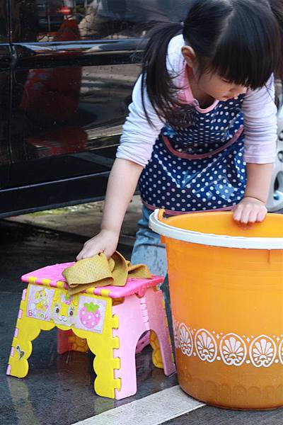 趁著爸爸把車擦乾的時候,蘋果也把自己墊腳的小椅凳擦乾淨,