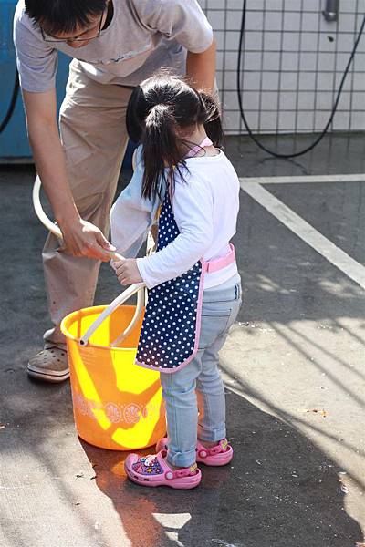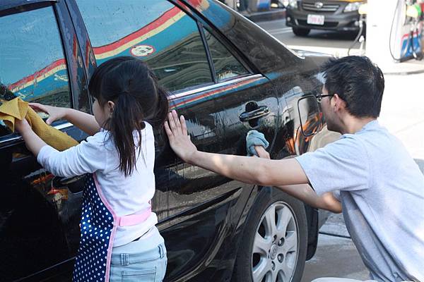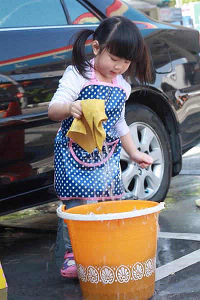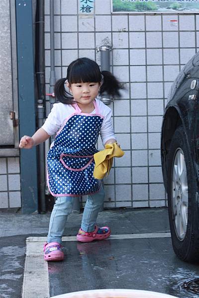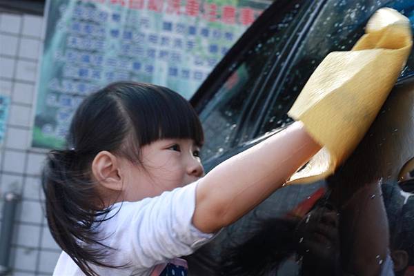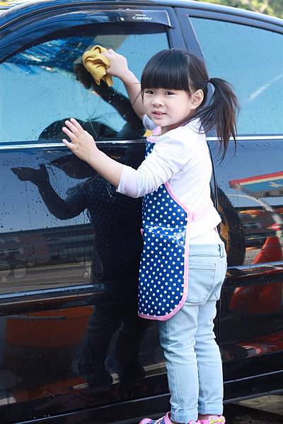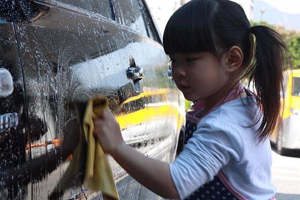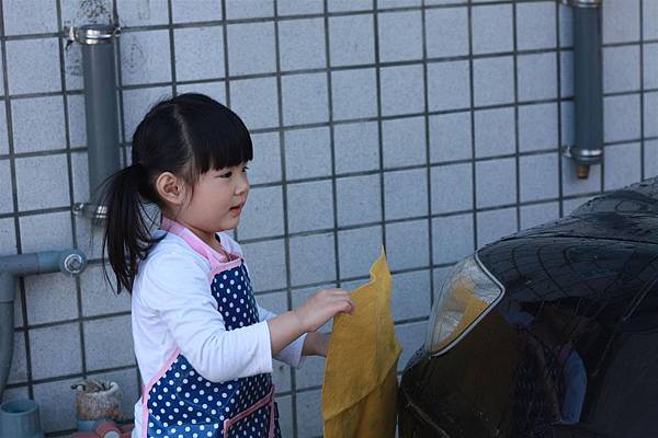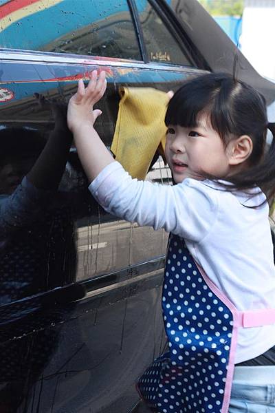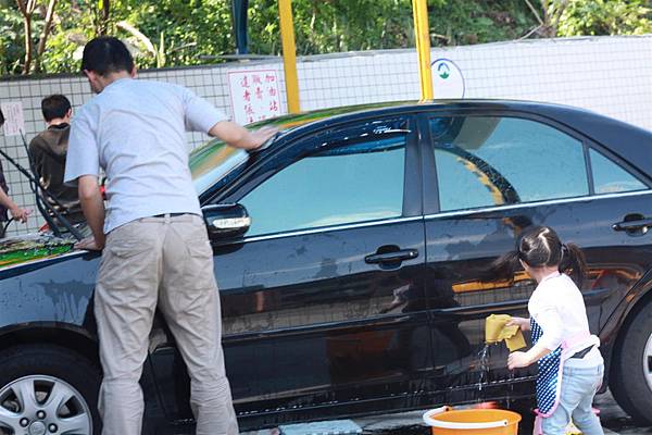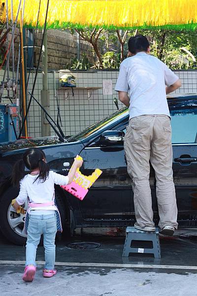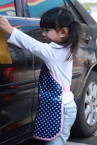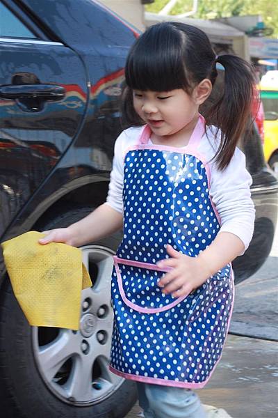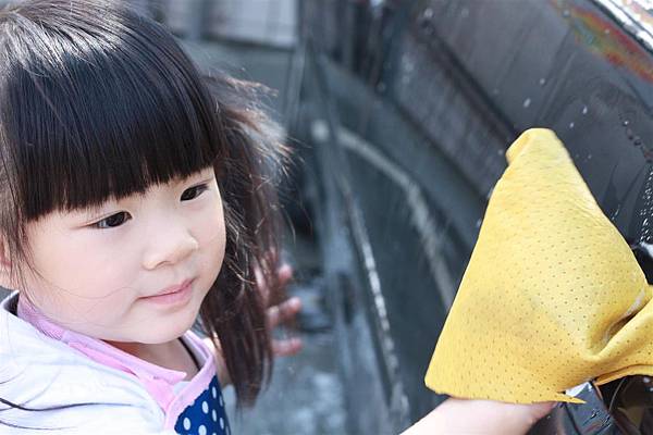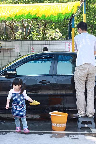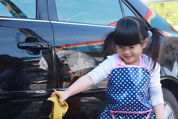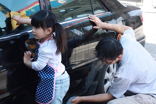 洗乾淨了,爸爸負責擦乾車子上的水漬