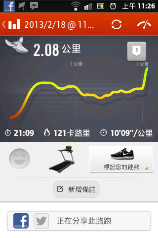 那麼運動記錄完成之後,就可以直接隨著網路分享到FB。