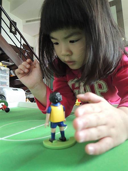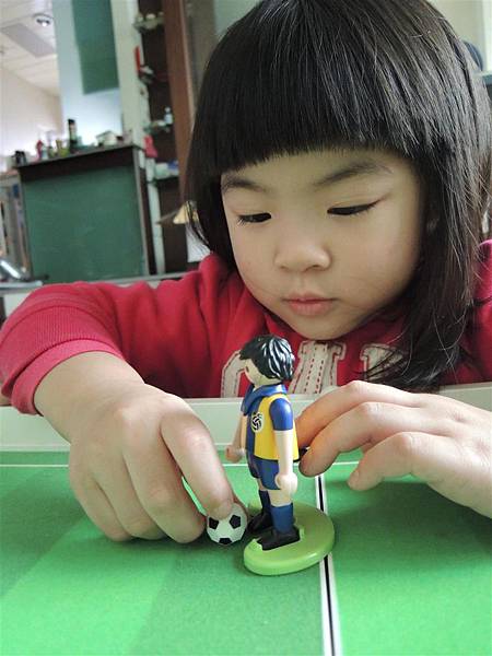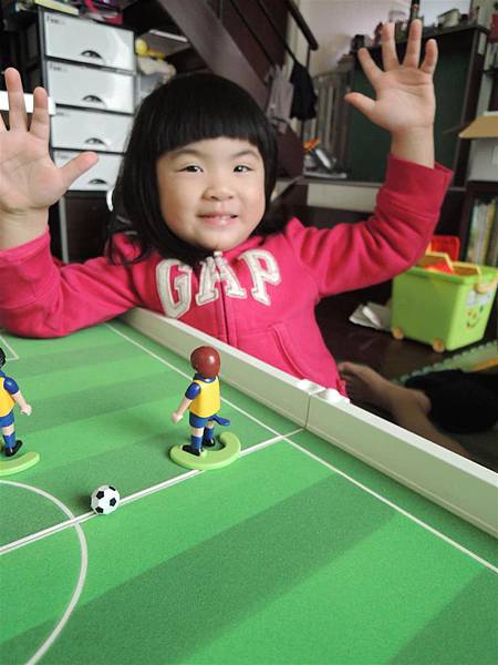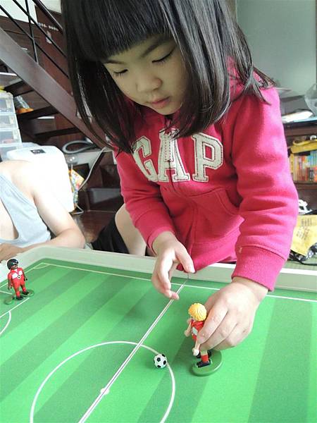 爸爸踢的時候,蘋果超緊張的,趕緊拿著守門員的搖桿保護球門,