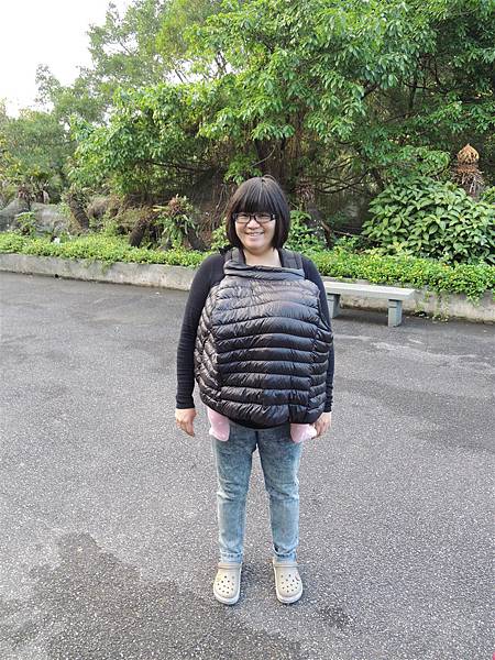 用了防寒披肩,我再用大外套整個把糖果妹包住,完全不怕冷。