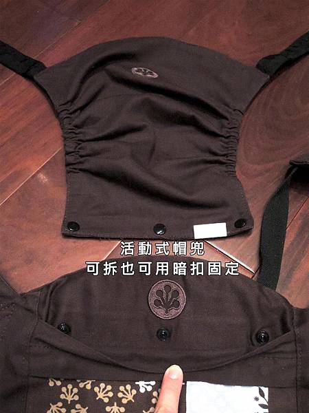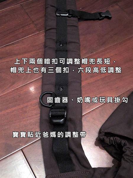 肩帶的部分有兩個暗扣,可以搭配帽兜上的三個暗扣作六段式的高低調整,