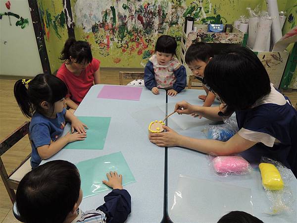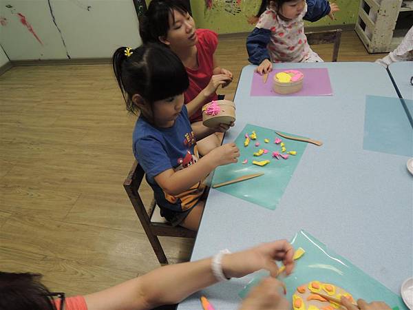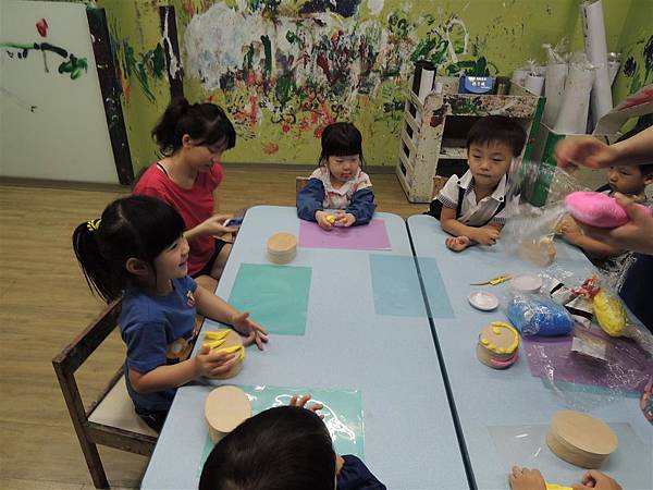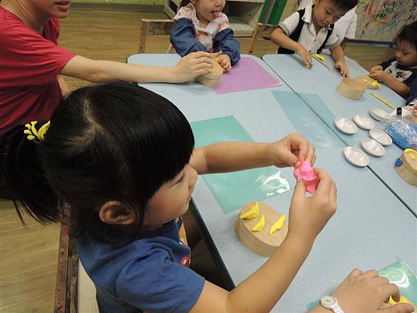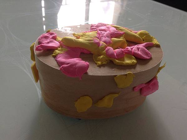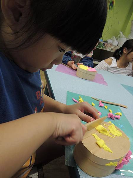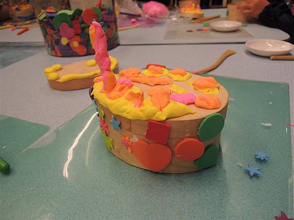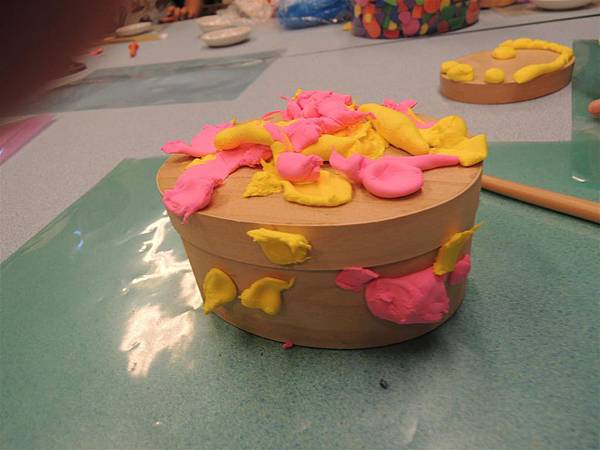 每個小朋友會發一個塗過白膠水的木寶盒,所以超輕土放上去也可以黏著住。