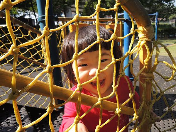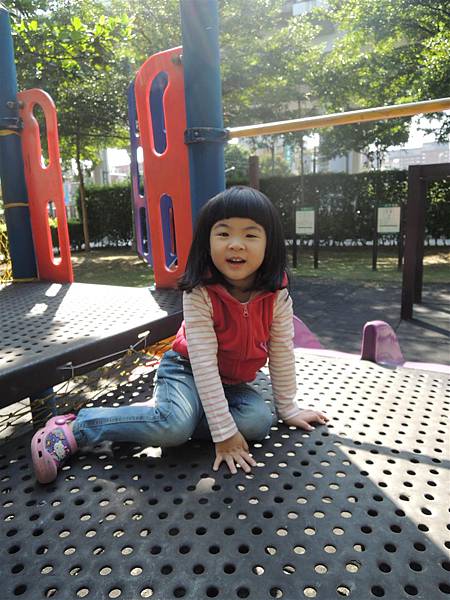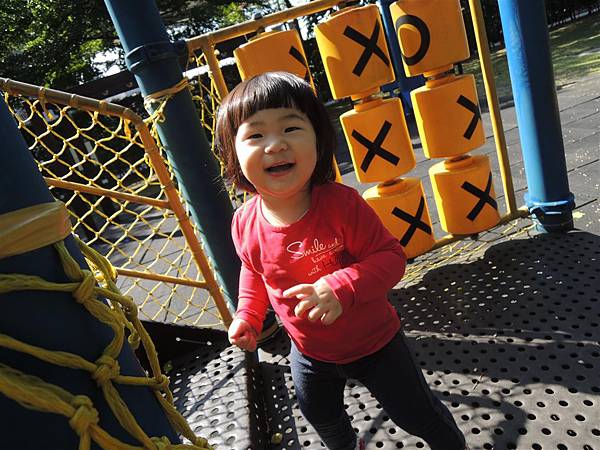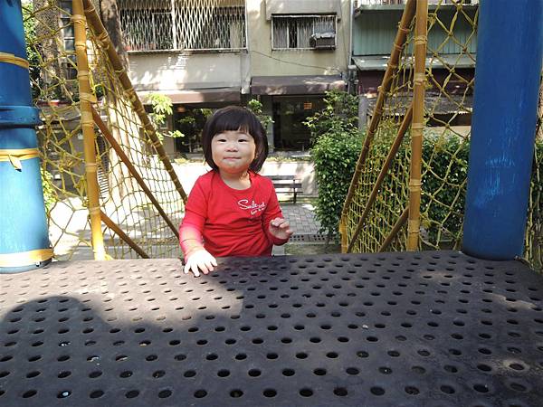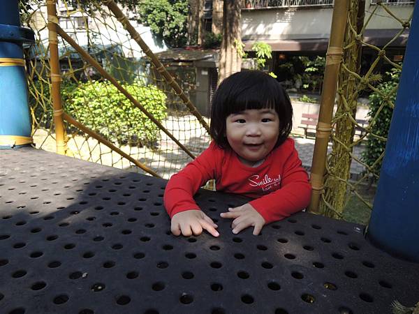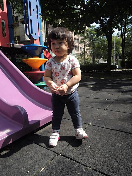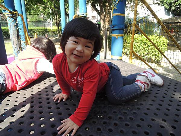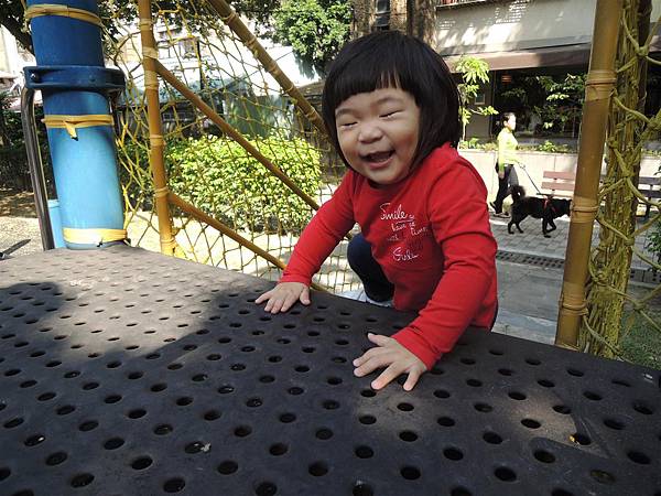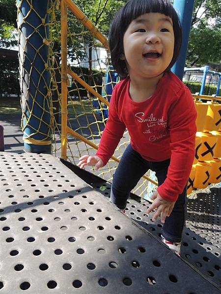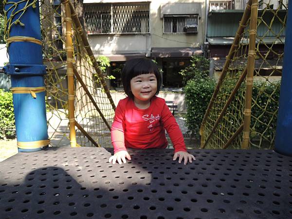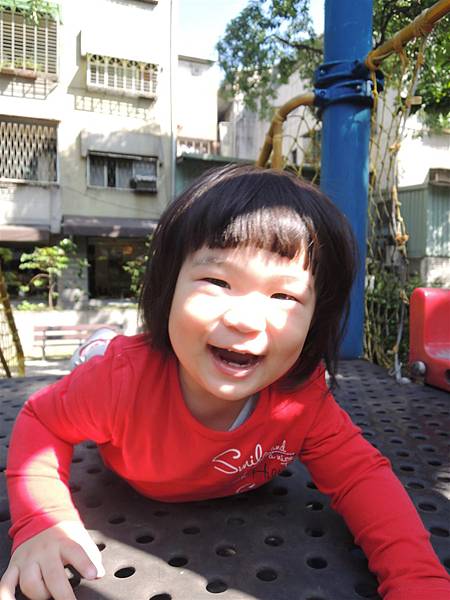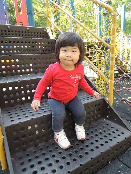 剛滿一歲四個月的糖果妹已經可以順利得自己爬上樓梯溜滑梯,